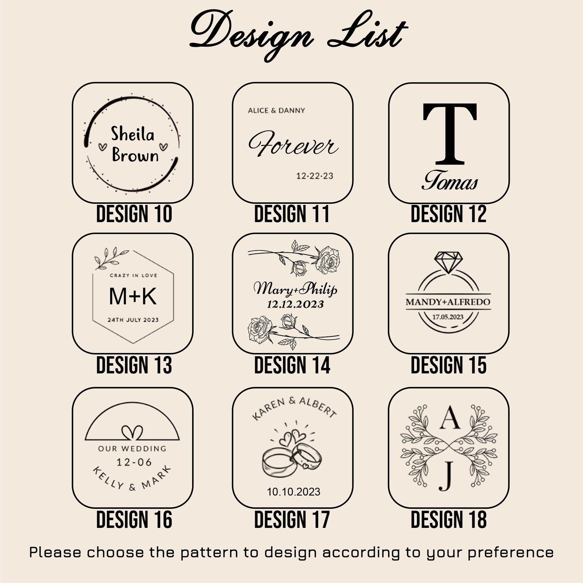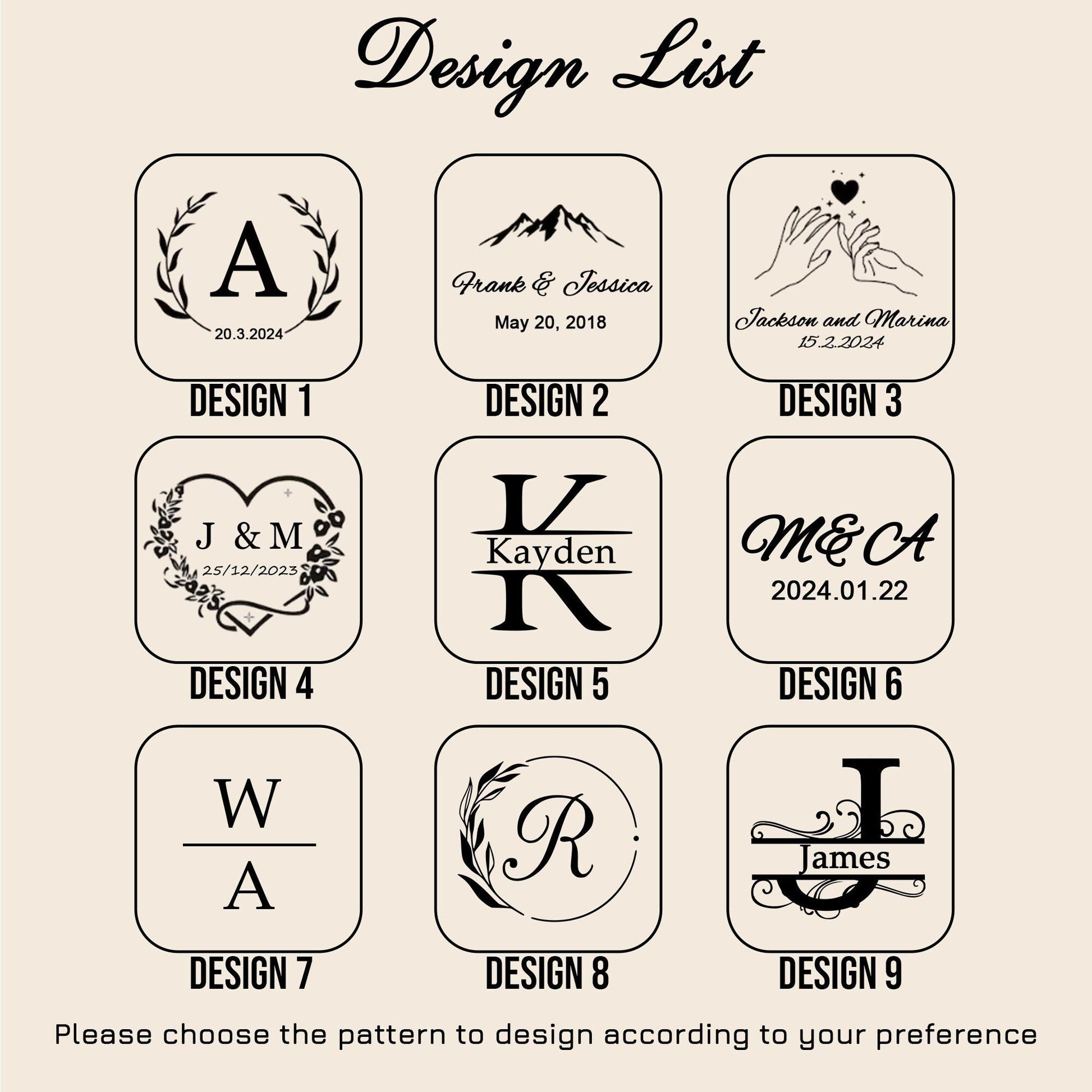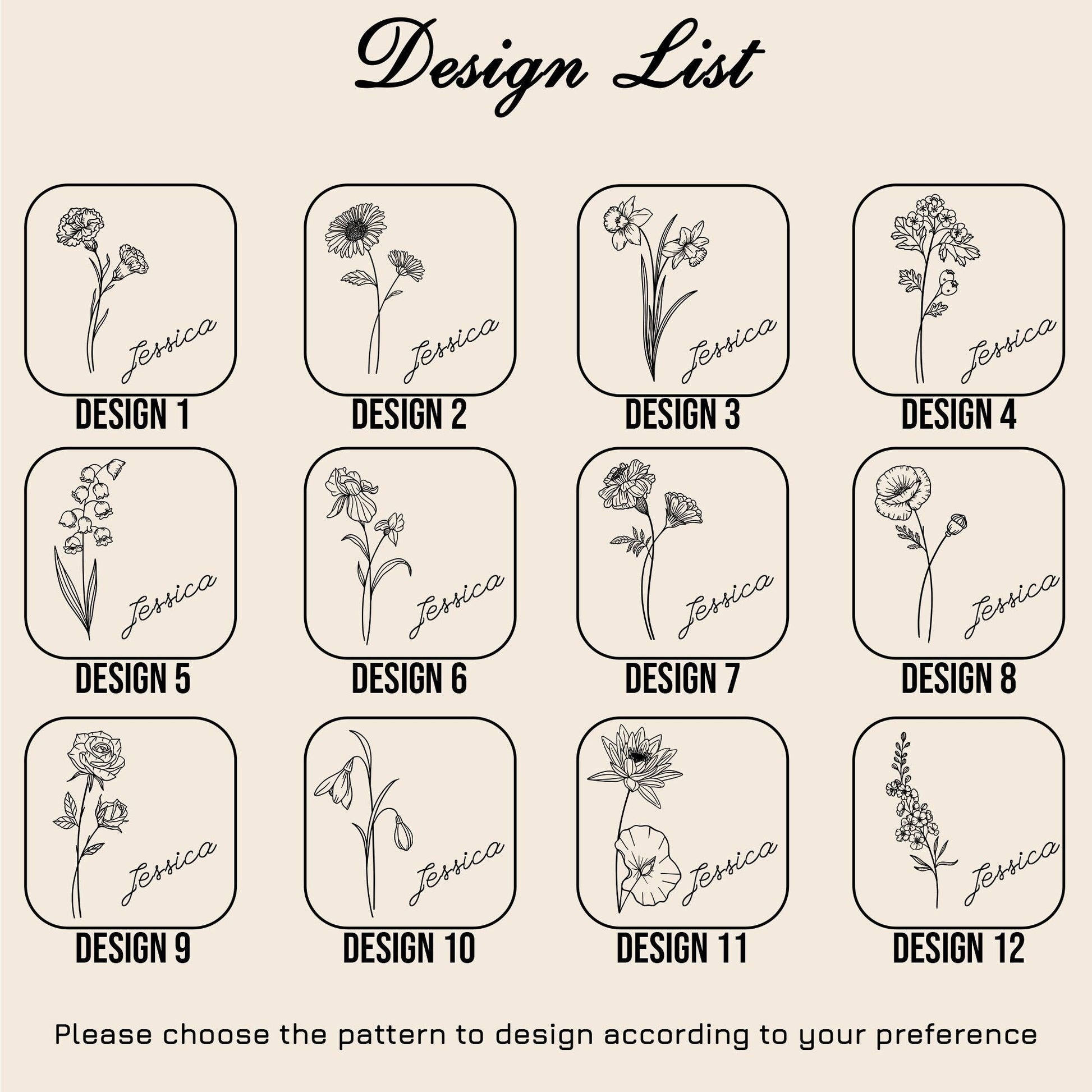 We have three designs, the first is a plain text design, the second is a birth flower design, and the third is a graphic design.