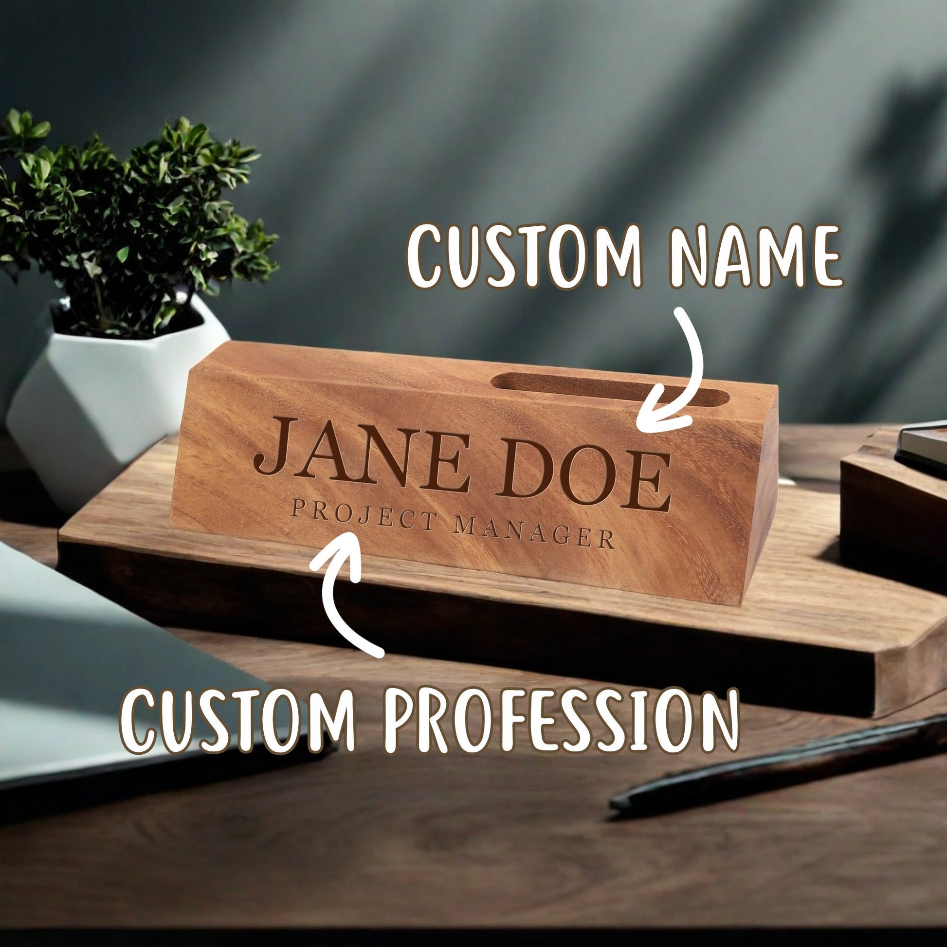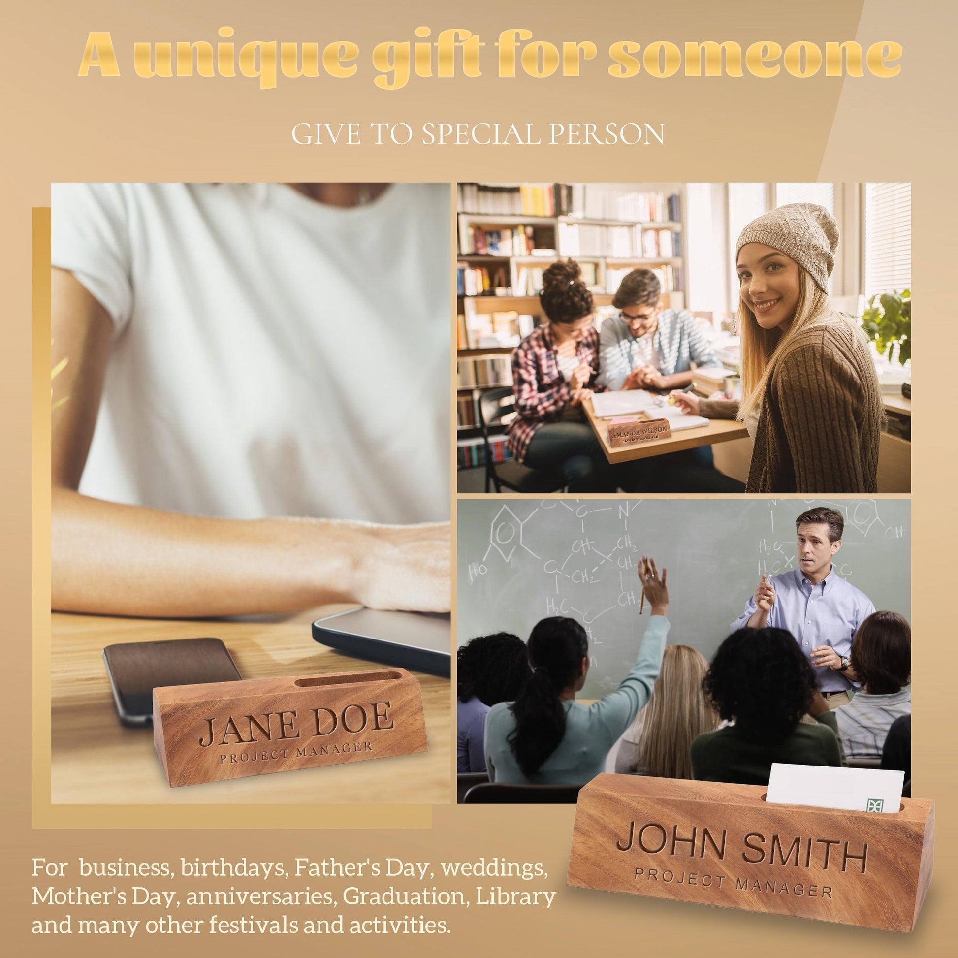 Our desk name plate is made of high quality walnut material and measures 25.5X7X6cm. laser engraved with your customized text. The desk name plate has a groove design, which is convenient for holding business cards. The design is simple and elegant.