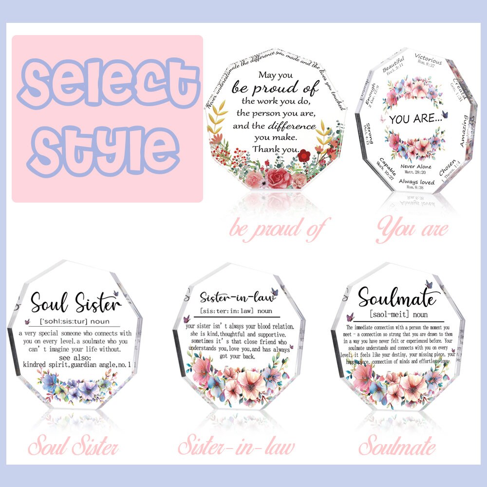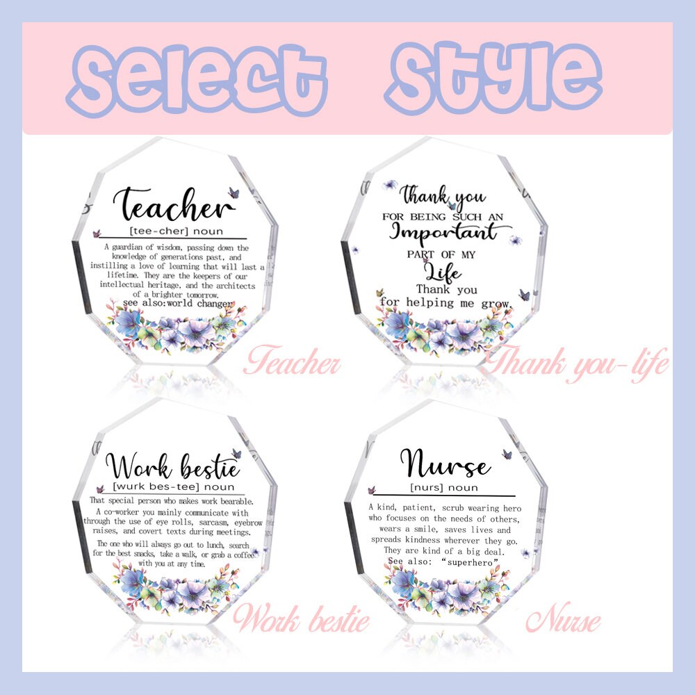 This delicate and interesting acrylic desktop decoration features a clear nonagon design with beautiful flowers and words expressing gratitude, perfect for gifting to the most grateful person in your life. Suitable for decorating a variety of occasions, such as placing on a coffee table, nightstand, desk, bookshelf, dresser, etc., suitable for a variety of styles of home, add a touch of bright color.