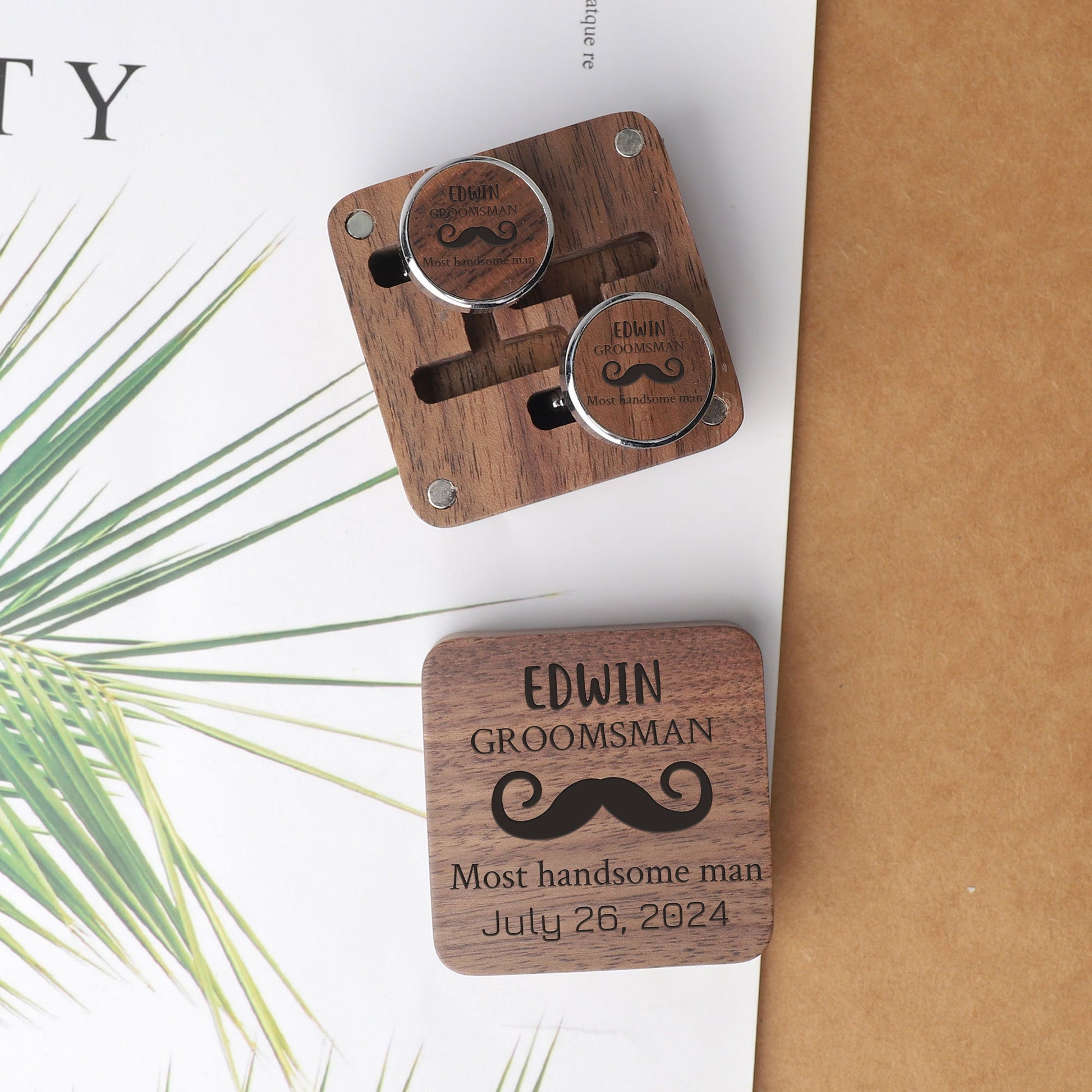 Personalized Cufflinks with Wooden Box, Custom Cuff Links, Engraved Wood Cufflink, Gift for Husband Fiancé Dad, Wedding Groomsmen Gifts